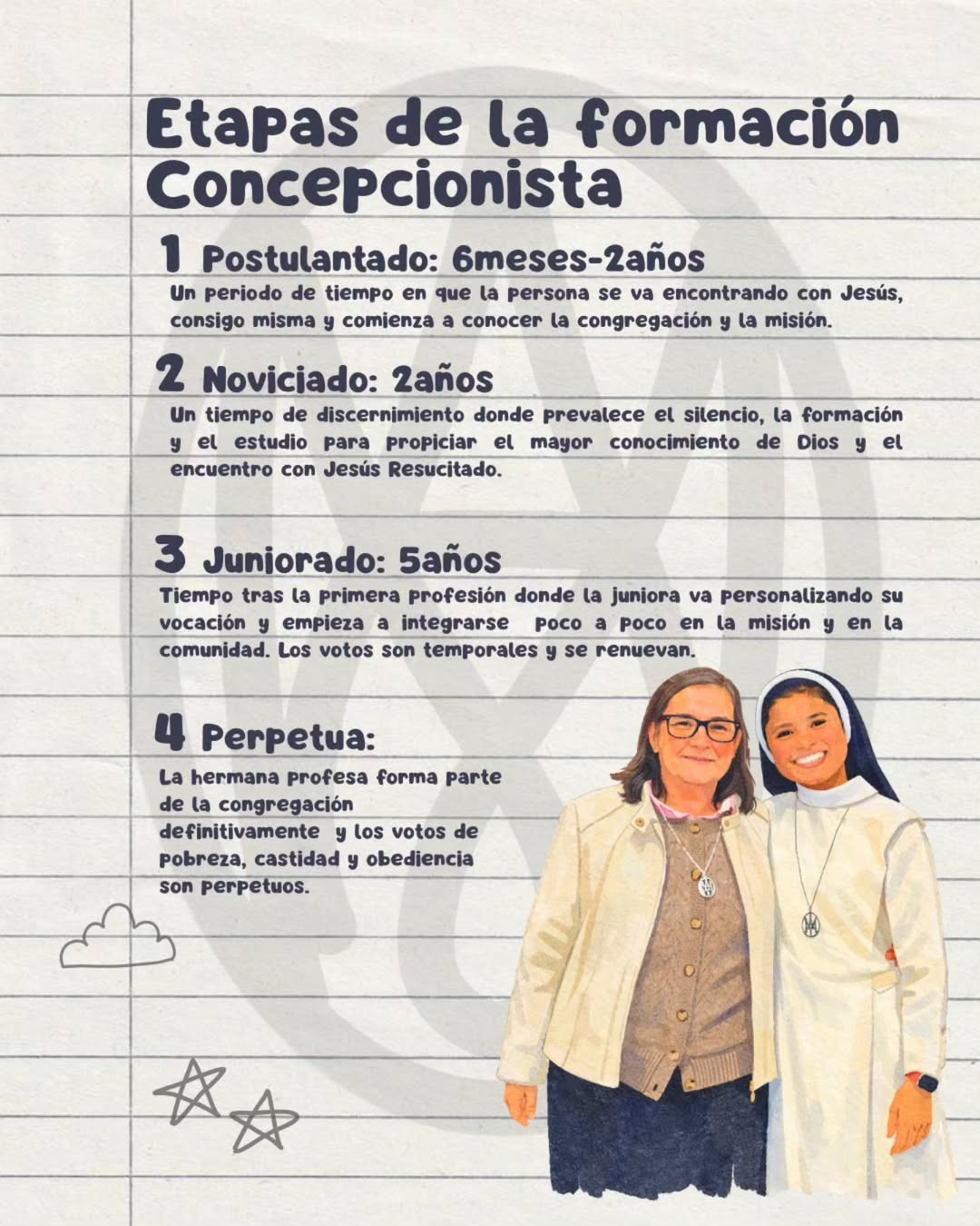 Desde el Noviciado Concepcionista de la Provincia de España nos invitan a conocer y a dar a conocer las etapas de formación para ser religiosa concepcionista. ¡Muchas gracias!