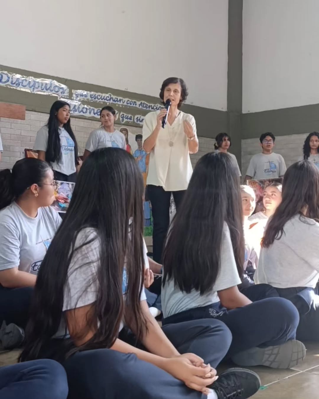 Luego fue el turno de saludar por los salones y los primeros en recibirla en su galería fueron los pequeños de educación inicial. Ya el día 14 tuvo lugar el recibimiento por parte de los estudiantes de bachillerato. Esta vez M. Belén estuvo acompañada de M. Mariana Guinand, Sup. Provincial, quien llegó muy temprano para participar de las actividades con M. Belén.