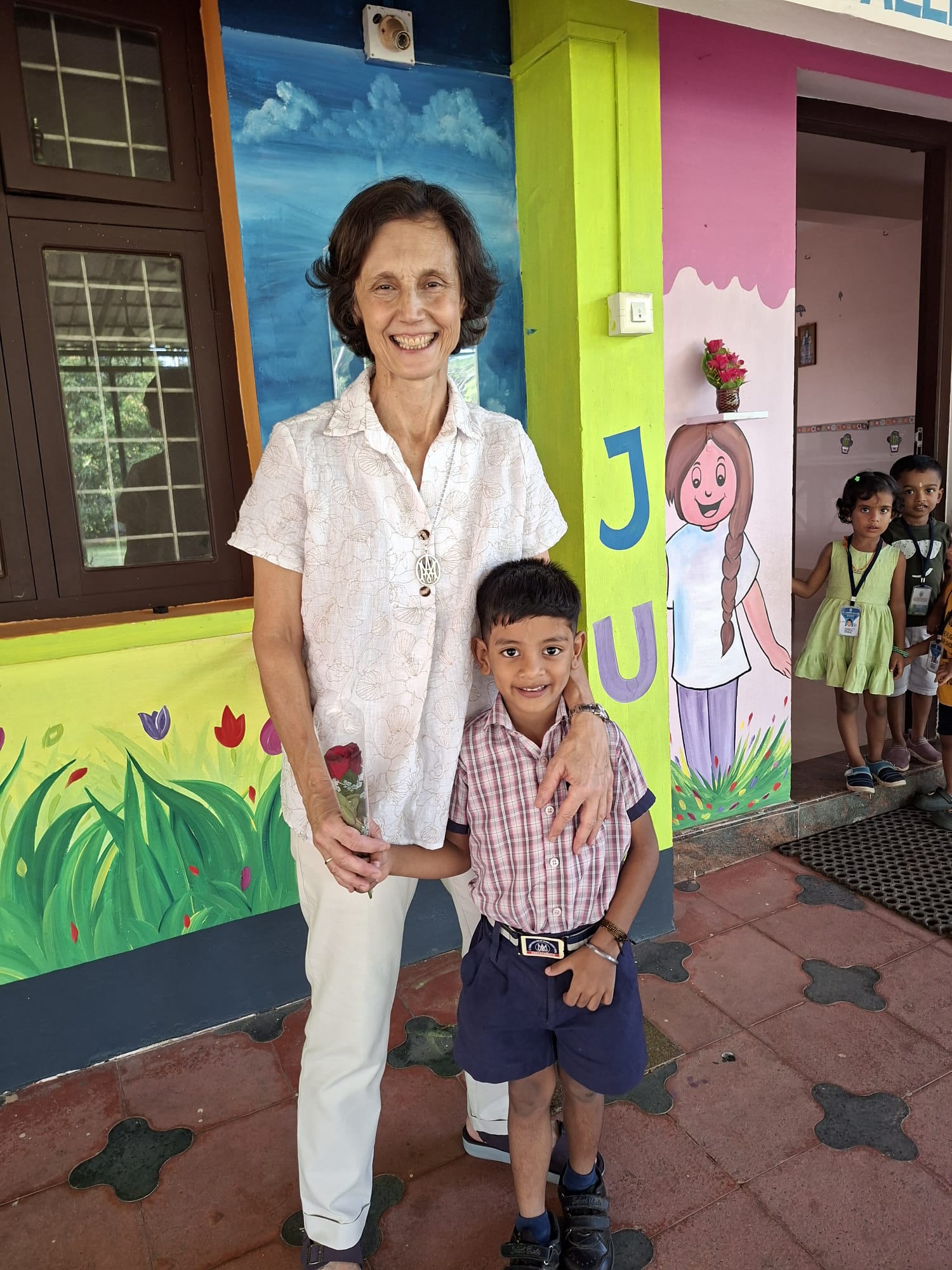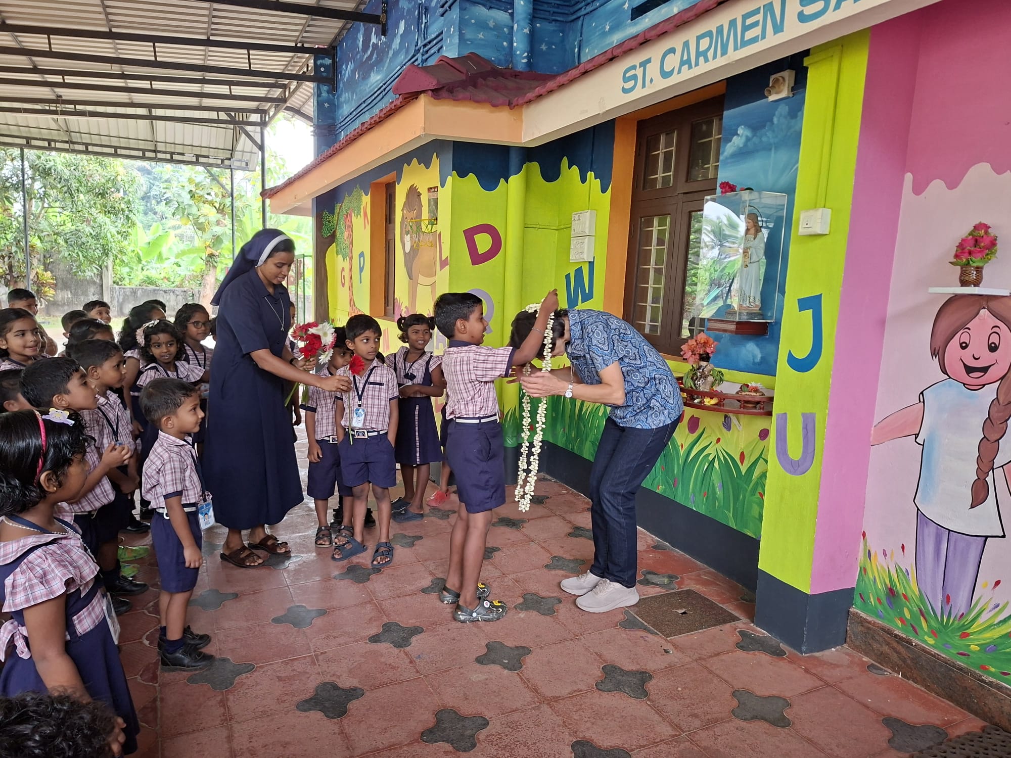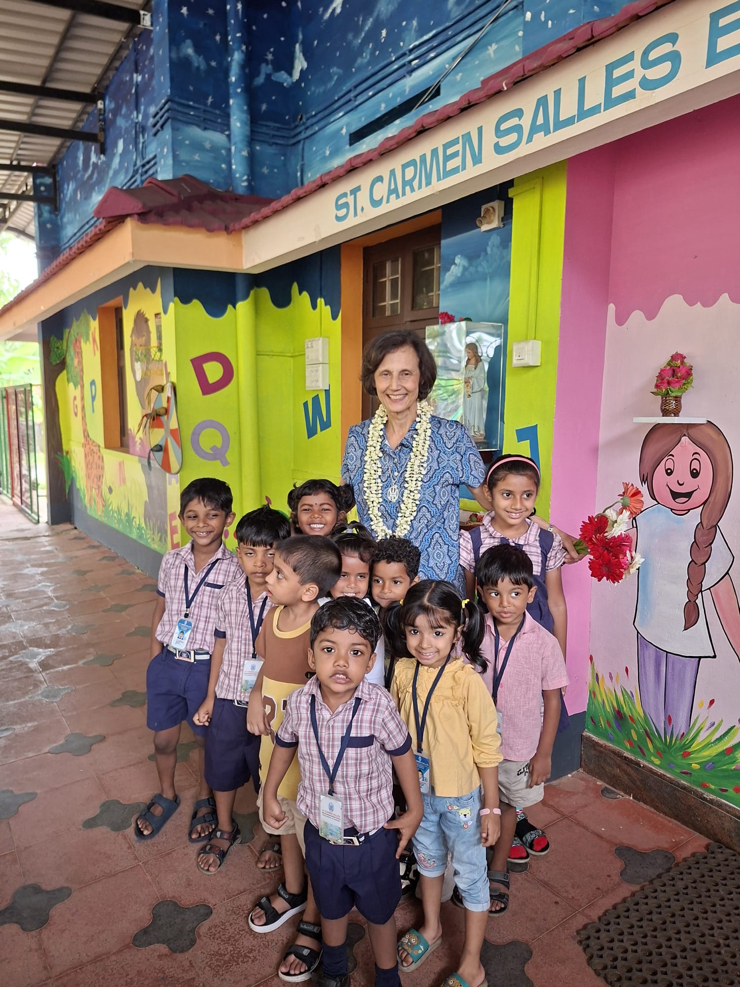 M. Belén Gómez de Castro, Superior Geral, Ele chegou à Índia no dia 27 de fevereiro para nossa comunidade Thelaturuth. Allí ha sido recibida con mucho cariño por los alumnos del colegio Saint Carmen Sallés que educa a niños de tres, cuatro y cinco años. Muchos de ellos ya eran conocidos, tras su reciente visita del año pasado y M. Belén ha podido comprobar, con satisfacción, cuáles han sido sus avances y cómo, poco a poco, el colegio ha ido incorporando nuevas metodologías en su día a día. Todo ello hace el colegio prospere, en buena medida por el buen reconocimiento que tiene entre las familias. En las fotos, en las que podemos verles vestidos con sus dos uniformes concepcionistas, se aprecia lo felices que son en una etapa del curso en la que preparan ya el festival de fin de curso y la graduación de los mayores.