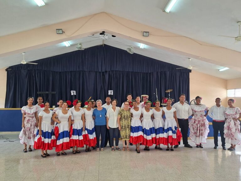 Bienvenida a M. Belén Gómez de Castro, Superiora general, M. Cristina Mazariegos, Ecónoma y Consejera general y M.Nieves Rosado, Consejera general en el colegio La Hora de Dios de República Dominicana.